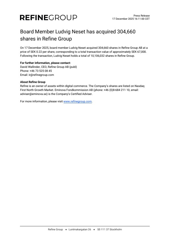 On 17 December 2025, board member Ludvig Neset acquired 304,660 shares in Refine Group AB at a price of SEK 0.22 per share, corresponding to a total transaction value of approximately SEK 67,000. Following the transaction, Ludvig Neset holds a total of 10,106,032 shares in Refine Group.