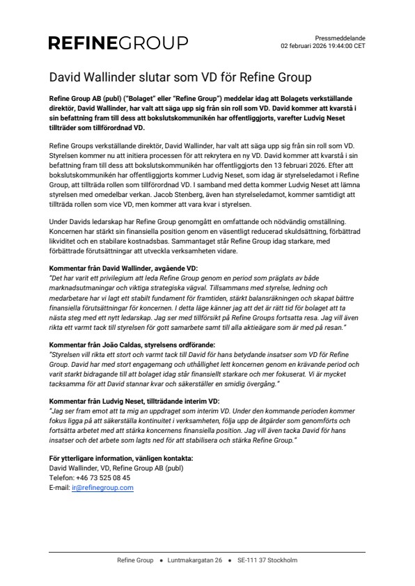 Refine Groups verkställande direktör, David Wallinder, har valt att säga upp sig från sin roll som VD. Styrelsen kommer nu att initiera processen för att rekrytera en ny VD. David kommer att kvarstå i sin befattning fram till dess att bokslutskommunikén har offentliggjorts den 13 februari 2026. Efter att bokslutskommunikén har offentliggjorts kommer Ludvig Neset, som idag är styrelseledamot i Refine Group, att tillträda rollen som tillförordnad VD. I samband med detta kommer Ludvig Neset att lämna styrelsen med omedelbar verkan. Jacob Stenberg, även han styrelseledamot, kommer samtidigt att tillträda rollen som vice VD, men kommer att vara kvar i styrelsen.