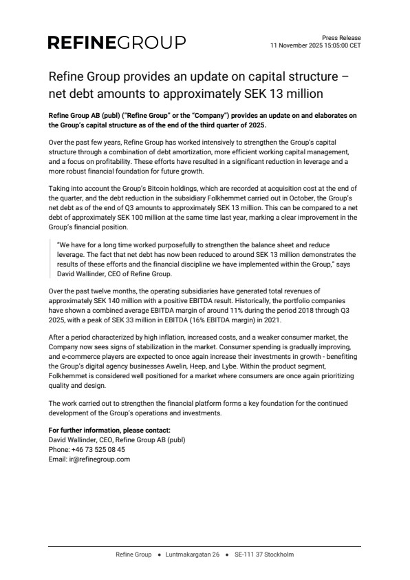 Refine Group AB (publ) (“Refine Group” or the “Company”) provides an update on and elaborates on the Group’s capital structure as of the end of the third quarter of 2025.