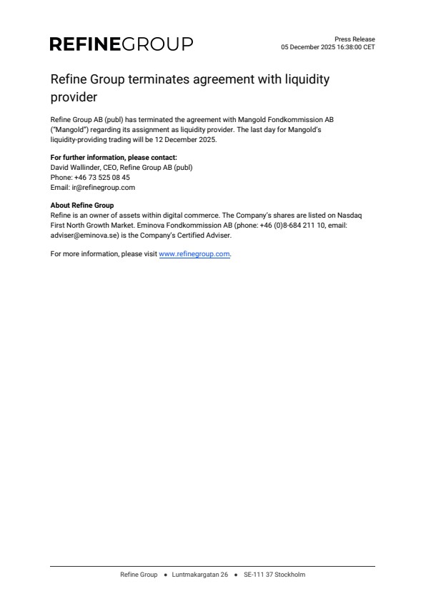 Refine Group AB (publ) has terminated the agreement with Mangold Fondkommission AB (“Mangold”) regarding its assignment as liquidity provider. The last day for Mangold’s liquidity-providing trading will be 12 December 2025.