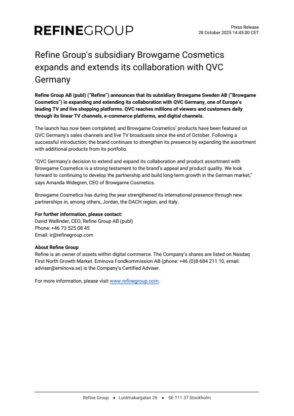 Refine Group AB (publ) (“Refine”) announces that its subsidiary Browgame Sweden AB (“Browgame Cosmetics”) is expanding and extending its collaboration with QVC Germany, one of Europe’s leading TV and live shopping platforms. QVC reaches millions of viewers and customers daily through its linear TV channels, e-commerce platforms, and digital channels.