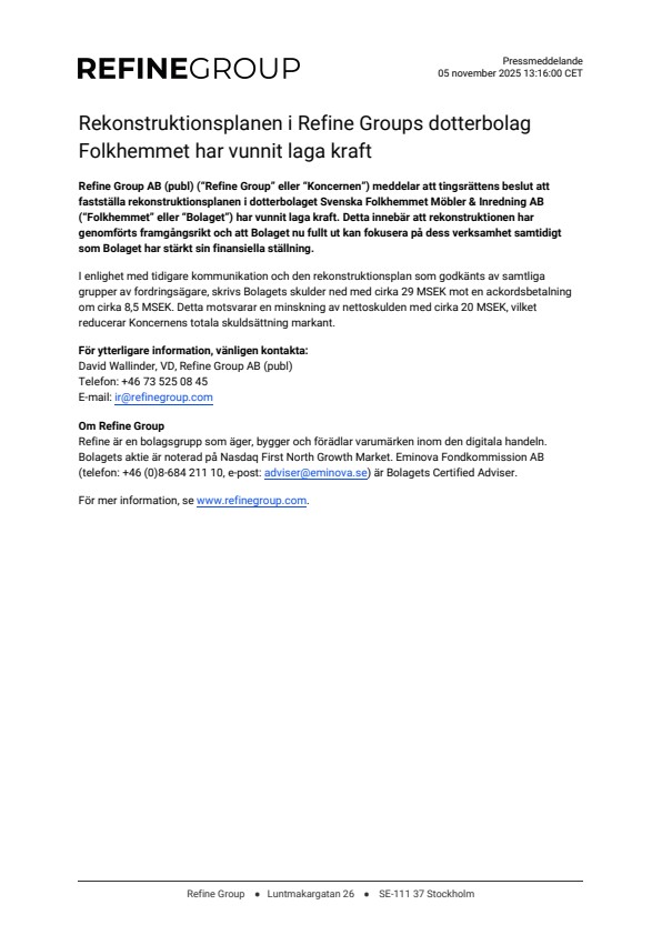 Refine Group AB (publ) (“Refine Group” eller “Koncernen”) meddelar att tingsrättens beslut att fastställa rekonstruktionsplanen i dotterbolaget Svenska Folkhemmet Möbler & Inredning AB (“Folkhemmet” eller “Bolaget”) har vunnit laga kraft. Detta innebär att rekonstruktionen har genomförts framgångsrikt och att Bolaget nu fullt ut kan fokusera på dess verksamhet samtidigt som Bolaget har stärkt sin finansiella ställning.