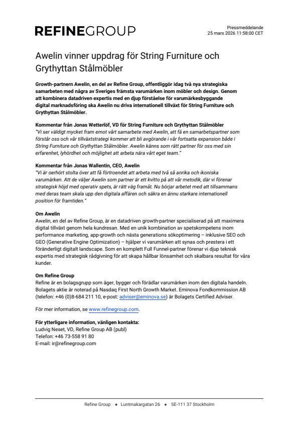 Growth-partnern Awelin, en del av Refine Group, offentliggör idag två nya strategiska