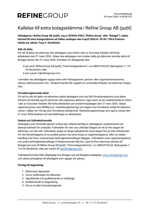 Aktieägarna i Refine Group AB (publ), org.nr 559026-0963 (”Refine Group” eller “Bolaget”), kallas härmed till extra bolagsstämma att hållas onsdagen den 8 april 2026 kl. 09:30 i TM & Partners lokaler på Jakobs Torg 3 i Stockholm.