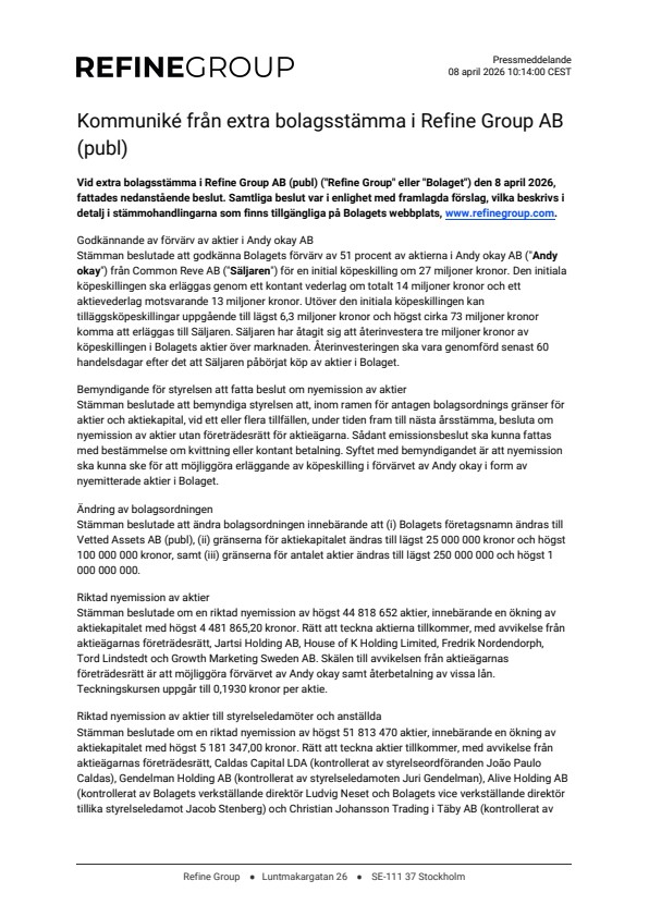 Vid extra bolagsstämma i Refine Group AB (publ) (“Refine Group” eller “Bolaget”) den 8 april 2026, fattades nedanstående beslut. Samtliga beslut var i enlighet med framlagda förslag, vilka beskrivs i detalj i stämmohandlingarna som finns tillgängliga på Bolagets webbplats, www.refinegroup.com.