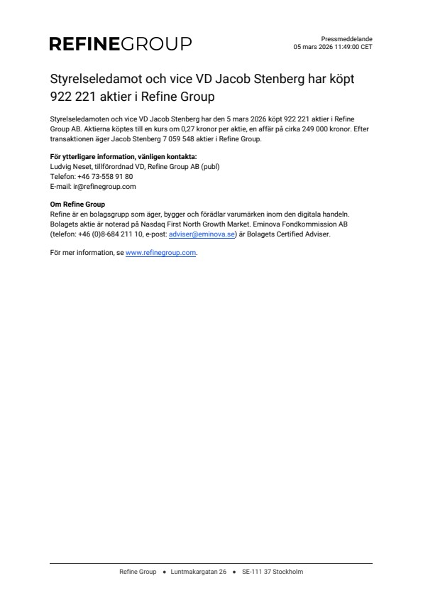 Styrelseledamoten och vice VD Jacob Stenberg har den 5 mars 2026 köpt 922 221 aktier i Refine Group AB. Aktierna köptes till en kurs om 0,27 kronor per aktie, en affär på cirka 249 000 kronor. Efter transaktionen äger Jacob Stenberg 7 059 548 aktier i Refine Group.