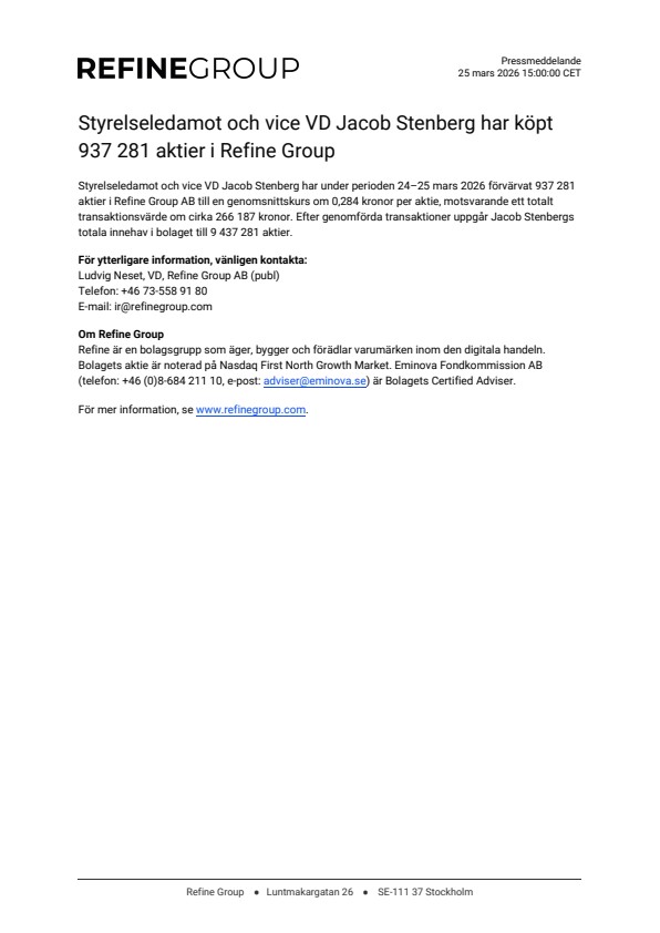Styrelseledamot och vice VD Jacob Stenberg har under perioden 24–25 mars 2026 förvärvat 937 281 aktier i Refine Group AB till en genomsnittskurs om 0,284 kronor per aktie, motsvarande ett totalt transaktionsvärde om cirka 266 187 kronor. Efter genomförda transaktioner uppgår Jacob Stenbergs totala innehav i bolaget till 9 437 281 aktier.