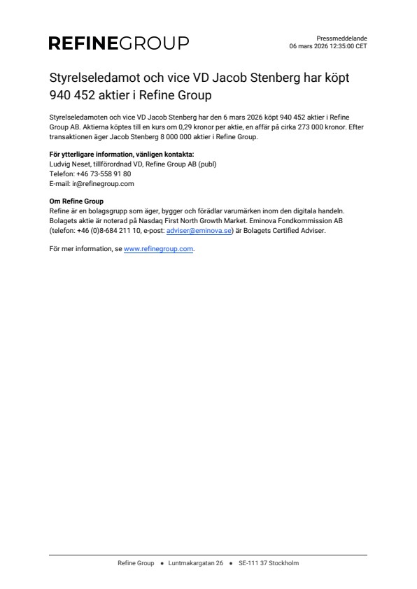 Styrelseledamoten och vice VD Jacob Stenberg har den 6 mars 2026 köpt 940 452 aktier i Refine Group AB. Aktierna köptes till en kurs om 0,29 kronor per aktie, en affär på cirka 273 000 kronor. Efter transaktionen äger Jacob Stenberg 8 000 000 aktier i Refine Group.
