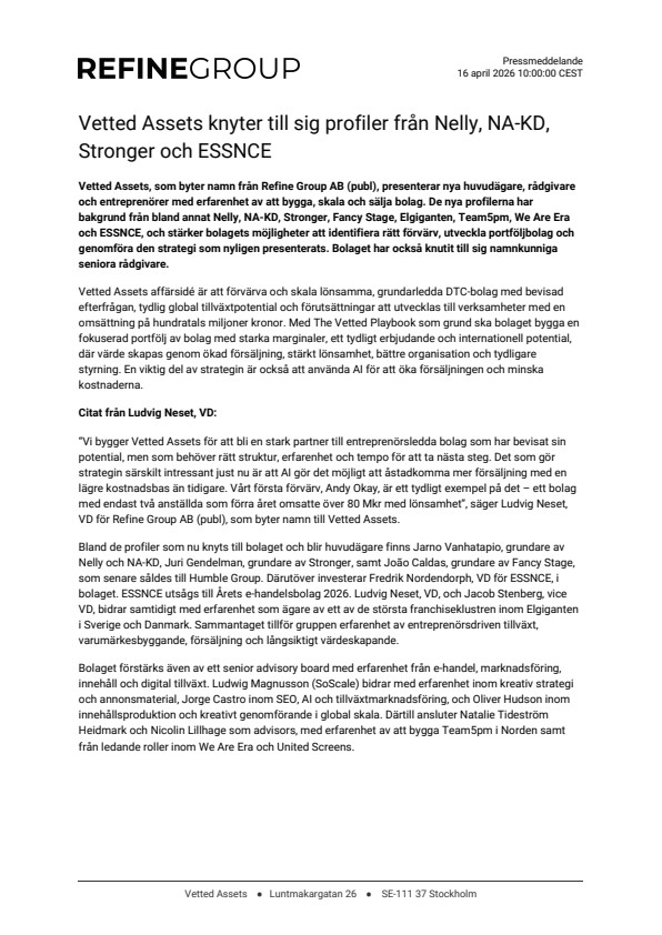 Vetted Assets, som byter namn från Refine Group AB (publ), presenterar nya huvudägare, rådgivare och entreprenörer med erfarenhet av att bygga, skala och sälja bolag. De nya profilerna har bakgrund från bland annat Nelly, NA-KD, Stronger, Fancy Stage, Elgiganten, Team5pm, We Are Era och ESSNCE, och stärker bolagets möjligheter att identifiera rätt förvärv, utveckla portföljbolag och genomföra den strategi som nyligen presenterats. Bolaget har också knutit till sig namnkunniga seniora rådgivare.